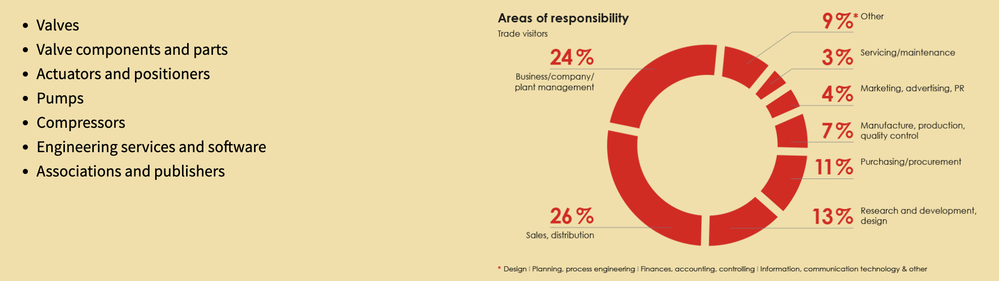 Vanên pîşesaziyê û teknolojiya vanan wekî teknolojiyên sereke hema hema di her sektora pîşesaziyê de neçar in. Li gorî vê yekê, gelek pîşesazî bi rêya kirrûbir û bikarhêneran li VALVE WORLD EXPO têne temsîl kirin: Pîşesaziya petrol û gazê, petrokimya, pîşesaziya kîmyewî, xwarin, pîşesaziya deryayî û deryayî, rêveberiya av û ava qirêj, pîşesaziya otomobîlan û endezyariya mekanîkî, teknolojiya derman û bijîşkî û her weha teknolojiya santralên elektrîkê.